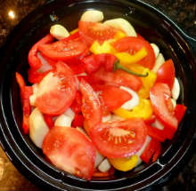 Смесь специй в оливковом масле Мясо маринуется несколько минут в оливковом масле со специями, затем долго томится в медленноварке вместе с овощами (лук, морковь, картофель, сладкий и острый перец, помидоры, чеснок) и маринадом.