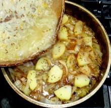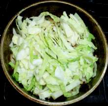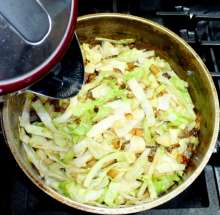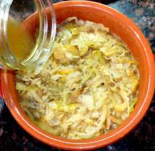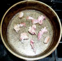| Квашеная капуста, яблоко, тмин. | Панированные в муке кусочки свинины обжариваются в жире, выкладываются в керамический горшочек на лавровые листья и перец горошком, следующим слоем выкладывается смесь свежей и квашеной тушеной капусты с пассерованным луком и тмином. Ингредиенты заливаются бульоном (овощным, свиным) и тушатся в духовке 45 минут при 180 С. |