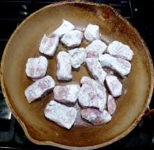 Выложить мясо в полиэтиленовый мешок с мукой, потрясти.