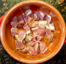 | Топлёное масло, гречка. | В посуду для запекания выкладывается мясо, заправляется топленым маслом, колеруется в духовке при высокой температуре. Затем добавляется мятый с солью лук, колеруется таким же образом, ингредиенты перемешиваются, запарвляются сметаной и тушатся в духовке 1 час при 180 С. По готовности в посуду выкладывается гречка быстрого приготовления, поливается топлёным маслом и жаркое томится некоторое время в духовке, после чего заправляется чесноком. |