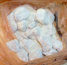 Смешать муку, соль, перец, сухой чеснок, выложить в пакет, добавить мясо, потрясти пакет. чтобы мясо равномерно запанировалось.