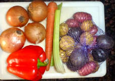 У меня - молодой разноцветный картофель, но это просто так случилось. Если у вас обычная картошка - нарежте её крупными кусками.