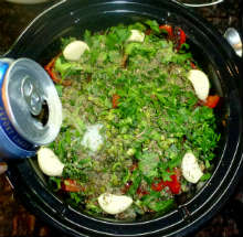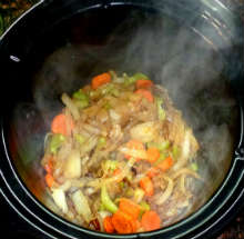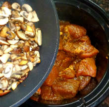 Если горшечек медленноварки недостаточно вместительный (как у меня) - вынуть шумовкой мясо.