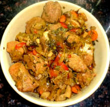 | Грибы, маринад (куркума + красный перец + хмели-сунели + сухой базилик + оливковое масло) | Свинина маринуется в оливковом масле со специями, затем томится 6-7 часов в пиве с поджаренными овощами и грибами. |