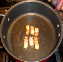 Поджарить на малом огне, чтобы вытопился жир. Выложить поджаренный бекон.
