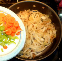 Добавить морковь и сельдерей. Жарить до мягкости моркови.