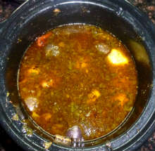 Если горшечек медленноварки недостаточно вместительный (как у меня) - вынуть шумовкой мясо.
