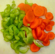Морковь нарезать кружочками, сельдерей - брусочками.