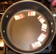 Поджарить на малом огне, чтобы вытопился жир. Выложить поджаренный бекон.
