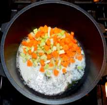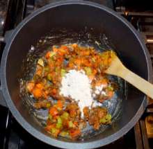Добавить муку, перемешать. Жарить на малом огне 1 минуту.