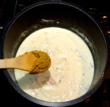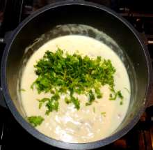 Добавить петрушку в соус, перемешать. Продолжать варить на малом огне до загустения соуса.