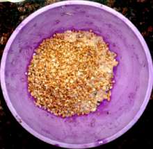 Долить кипятка так, чтобы вода покрыла ингредиенты. Тщательно размешать, следя за тем, чтобы исчезли комки муки.