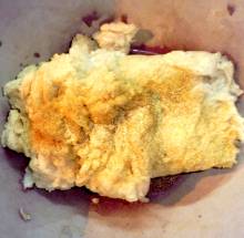 Выложить в миску, добавить любимые специи (у меня - приправа для рыбы, сухой чеснок) а также сахар, соль, перец).