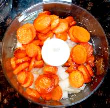 Жареный и сырой лук и морковь выложить в чашу блендера.