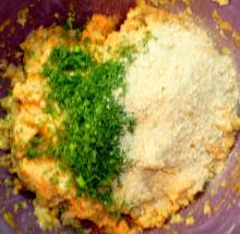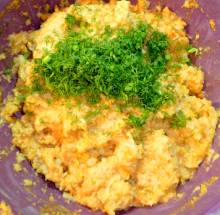 Переложить в миску к полуфабрикату, Добавить яйцо, растительное масло, зелень..