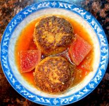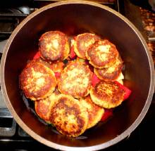 | Свекла, яйца, морковь, жареный и сырой лук, белый хлеб, сахар. | Из рыбного полуфабриката, приготовленного с добавлением замоченного в воде хлеба, сырого и жареного лука, поджаренной моркови, яиц, формируются котлетки, которые затем обжариваются и томятся с овощами (свекла, морковь). |