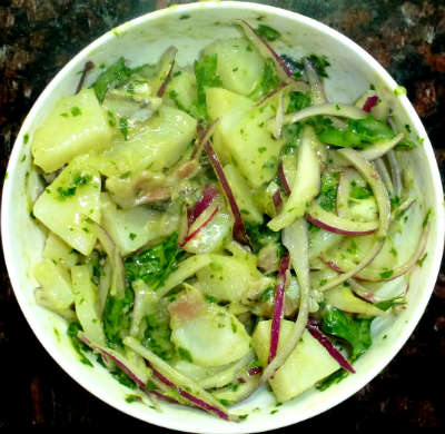 У кильки отделить голову и выпотрошить. Филе не снимать. Нарезать тушки кусочками шириной 1 см. Смешать отваренный картофель, лук, кильку. Заправить зеленью петрушки, маслом и уксусом.