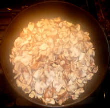 Свежие грибы нарезать пластинками, выложить в разогретую сковороду с растительным маслом. Туда же добавить нарезанные сухие грибы.