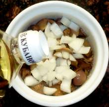 Подсолнечное масло, лук, чеснок | Солёные грибы смешиваются с сырым луком, рубленным чесноком и заправляются подсолнечным маслом и уксусом. |