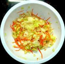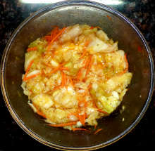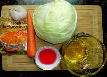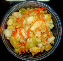 Набор специй для корейской моркови. Белокачанная капуста режется квадратиками, мнется с солью и сахаром до появления сока, смешивается с тертой морковью, чесноком и заливается кипящим маслом со специями. Затем капуста заправляется уксусом и выдерживается под гнетом 12 часов.