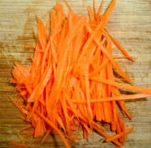 Натареть морковь на терке для корейской моркови или нарезать тонкими брусочками.
