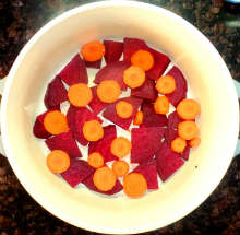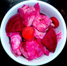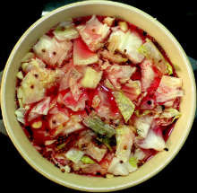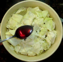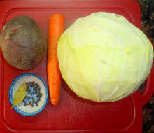Гвоздика, чеснок, свекла, уксус, сахар Капуста вместе с нарезанными сырыми свеклой и морковью заправляется специями, заливается кипящим рассолом и выдерживается несколько дней при комнатной температуре.