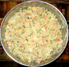 Традиционное украшение русского новогоднего стола. Мы помним его с детства, казалось, он был всегда, однако современный его вариант появился только в 60-е годы прошлого века. Как бы то ни было, а праздничный стол без оливье - не стол. Но актуален Оливье и после Новогодней ночи, учитывая десятидневные каникулы. У каждой хозяйки теперь свой рецепт этого салата. Есть он и в нашей семье. Основное отличие от традиционного рецепта - замена колбасяы жареной курицей. Эта замена кардинально меняет вкус салата, облагораживая его.