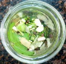 Выложить зелень и перец горошком в банку, добавить чеснок, нарезанный пластинками, горчицу.