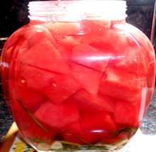 | Укроп, чеснок, уксус. | В банку укладываются стебли укропа, чеснок, лавровый лист, перец горошком. Поверх неплотно выкладываются кусочки арбуза без корки, ингредиенты заливаются горячим рассолом (вода, соль, сахар, уксус). Банка закрывается крышкой и выдерживается 2-3 недели в холодильнике. |
