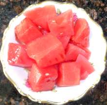 Арбуз нарезать кусочками толщиной 2-3 см.