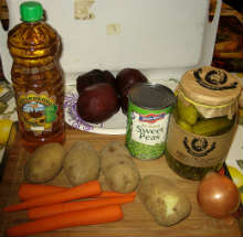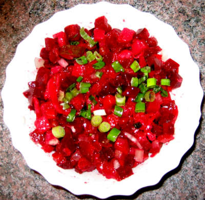 Свекла, зелёный горошек Корнеплоды отвариваются, нарезаются кубиками, добавляется консервированный горошек, соленые огурцы, лук, квашеная капуста. Смесь заправляется растительным маслом, солью и перцем.