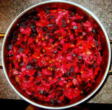 Есть одна тонкость, касающаяся лука. Блюда с сырым луком не рекомендуется хранить - как не странно, считается, что на луке возникают колонии вредоносных бактерий, которые могут привести к пищевому отравлению. Но винегрет, как правило, делается в больших количествах и подается к столу несколько дней. Поэтому винегрет в объеме, рассчитанном на текущий день, заправляется сырым луком прямо перед подачей на стол.