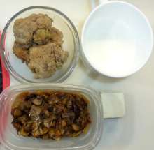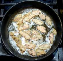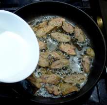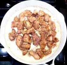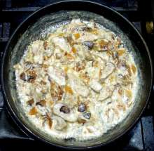 | Жареные грибы с луком, жареная куриная печёнка. | Жареная куриная печёнка, нарезанная ломтиками, выкладывается в сковороду с растопленным сливочным маслом, прогревается, добавляется молоко и жареные грибы с луком, блюдо тушится 5-7 минут. |