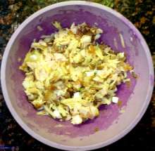 Жареные грибы с луком, яблоко, горчица. Остатки жареной (варёной) курицы, жареные грибы с луком, тёртое яблоко, рубленное яйцо смешиваются в миске, добавляется соль и перец. Подготовленная масса выкладывается в формы для запекания, заливается сметанным соусом (сметана + разведенная в воде мука + чеснок + горчица + укроп), посыпается сыром и запекается 15-20 минут при 200 С.