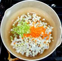 Когда лук станет прозрачным, добавить к нему морковь и сельдерей.