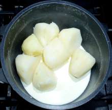 С готового картофеля слить воду, отодвинуть его в сторону, на дно налить молоко.