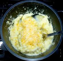 Выложить 2/3 сыра к картофелю, тщательно перемешать, добиваясь однородности.