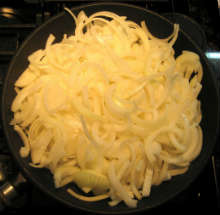 Жарить до появления красной корочки. Одновременно нарезать лук полукольцами.