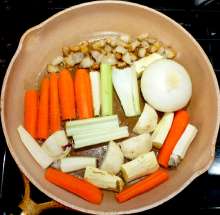 | Бараний жир, обжаренные коренья, бараньи кости. | Баранья мякоть, кости, предварительно поджаренные на бараньем жире овощи (морковь, лук, стебель сельдерея, репа, корень петрушки), жесткие стебли зелени, сухие коренья, специи закладываются в контейнер скороварки, заливаются холодной водой и варятся при закрытой крышке при малом нагреве 2 часа. Готовый бульон процеживается. |