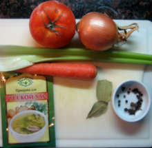 Убавить огонь до нижесреднего. Добавить овощи: нечищенную луковицу, корень петрушки, морковь, стебель сельдерея. Добавить специи: перец горошком, лавровый лист.