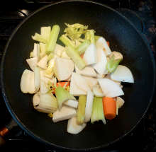 Этот бульон отличается от того, котрый мы привыкли варить, непривычными ингредиентами (лук-порей, репа) и тем, что все коренья и овощи предварительно поджариваются.