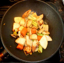 Лук-порей нарезать кружками, репу - полукружьями, морковь и сельдерей - поперек продольной оси.