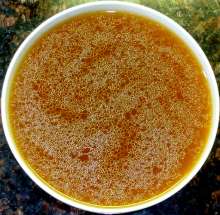| Обжаренные в духовке говяжьи (телячьи) кости, поджаренные коренья и корнеплоды. | Говяжьи (телячьи) кости поджариваются в духовке, овощи - на сковороде. Подготовленные ингредиенты выкладываются в контейнер скороварки, варятся 1.5-2 часа. Готовый бульон процеживается. |