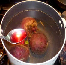 | Уксус, лимонный сок | Неочищенная свекла заливается холодной водой и варится с добавлением уксуса до готовности, затем остужается в холодной воде, чистится, натирается на терке и обжаривается в масле. |