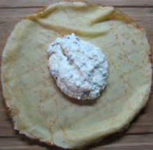 Вымешать начинку. На середину блина выложить от одной до 3-х столовых ложек начинки (зависит от размеров блина).
