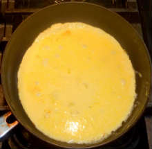 | Жареные грибы с луком, тертый сыр | Омлетная смесь с вмешанным в неё растопленным маслом выливается на сковороду. По готовности на половину омлета добавляются жареные грибы с луком, посыпаются тертым сыром и омлет выкладывается на тарелку, сложенный пополам. |