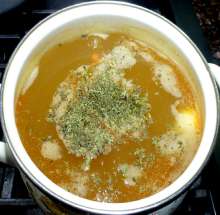 Подготовить куриный бульон. Если он был заморожен - предварительно разморозить.