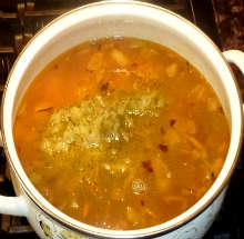 Настоящий русский суп - густой, ароматный, красивый. Обычно его приготовление занимает не меньше 2-х часов, но мы сократим время готовки до 25 минут за счет использования заготовок: куриного бульона, отваренных куриных потрошков, отваренной перловки и суповой заправки.