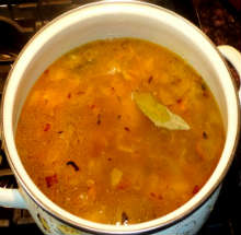 Добавить лавровый лист и перец горошком. Доварить до готовности картофеля и выключить огонь.