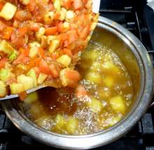 | Поджаренные кабачки, тушеные в томатной заправке. | В курином бульоне отваривается картофель, добавляется овощная заправка (кабачек, жареный лук, помидоры), отварная (жареная) курица (по желанию) суп доводится до кипения и снимается с огня. При подаче в тарелки выкладывается варёная лапша и заливается супом. |